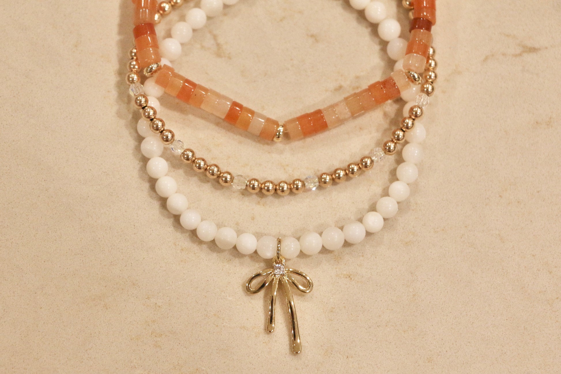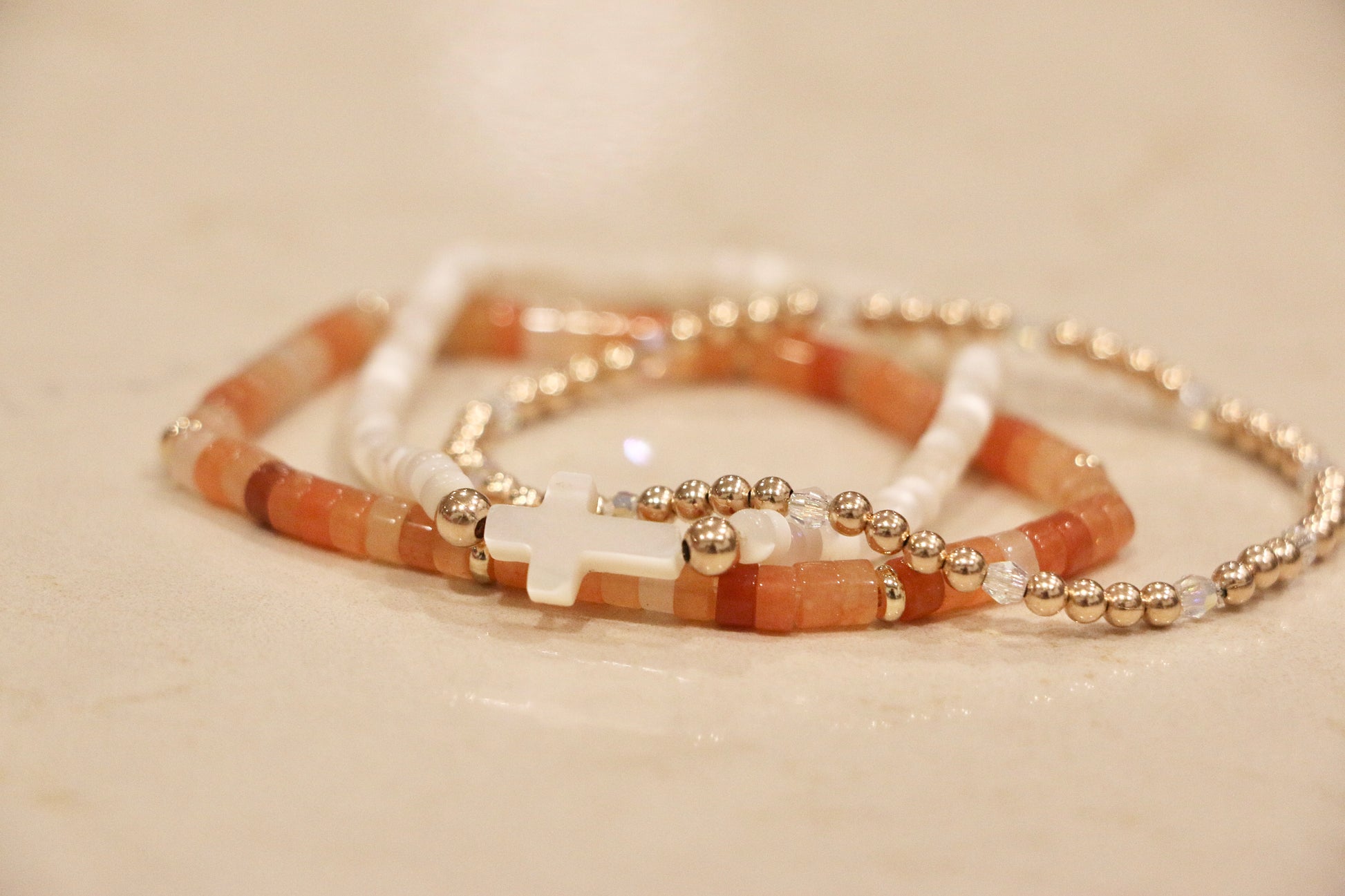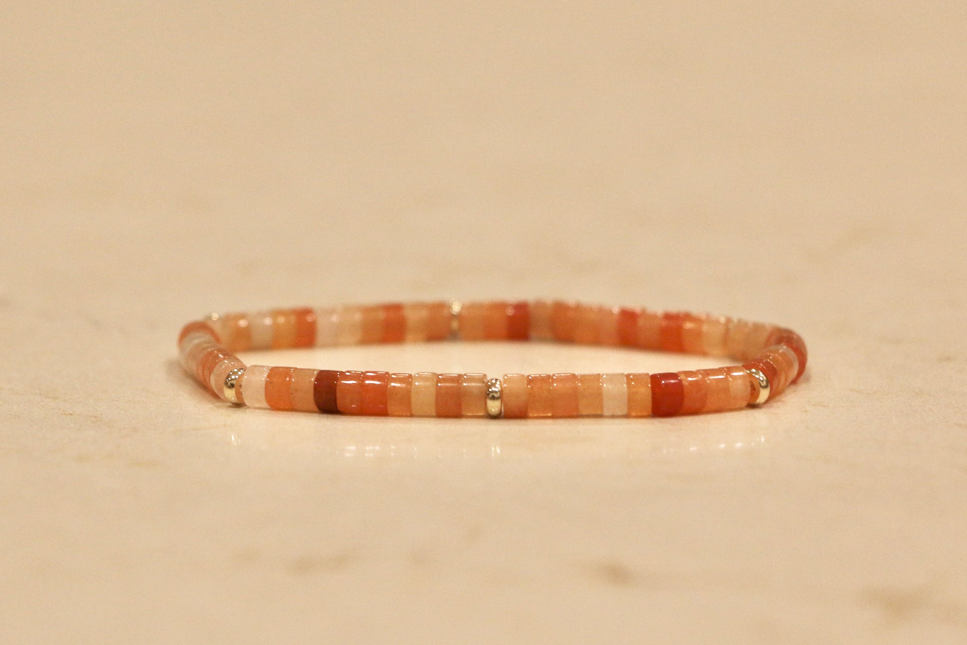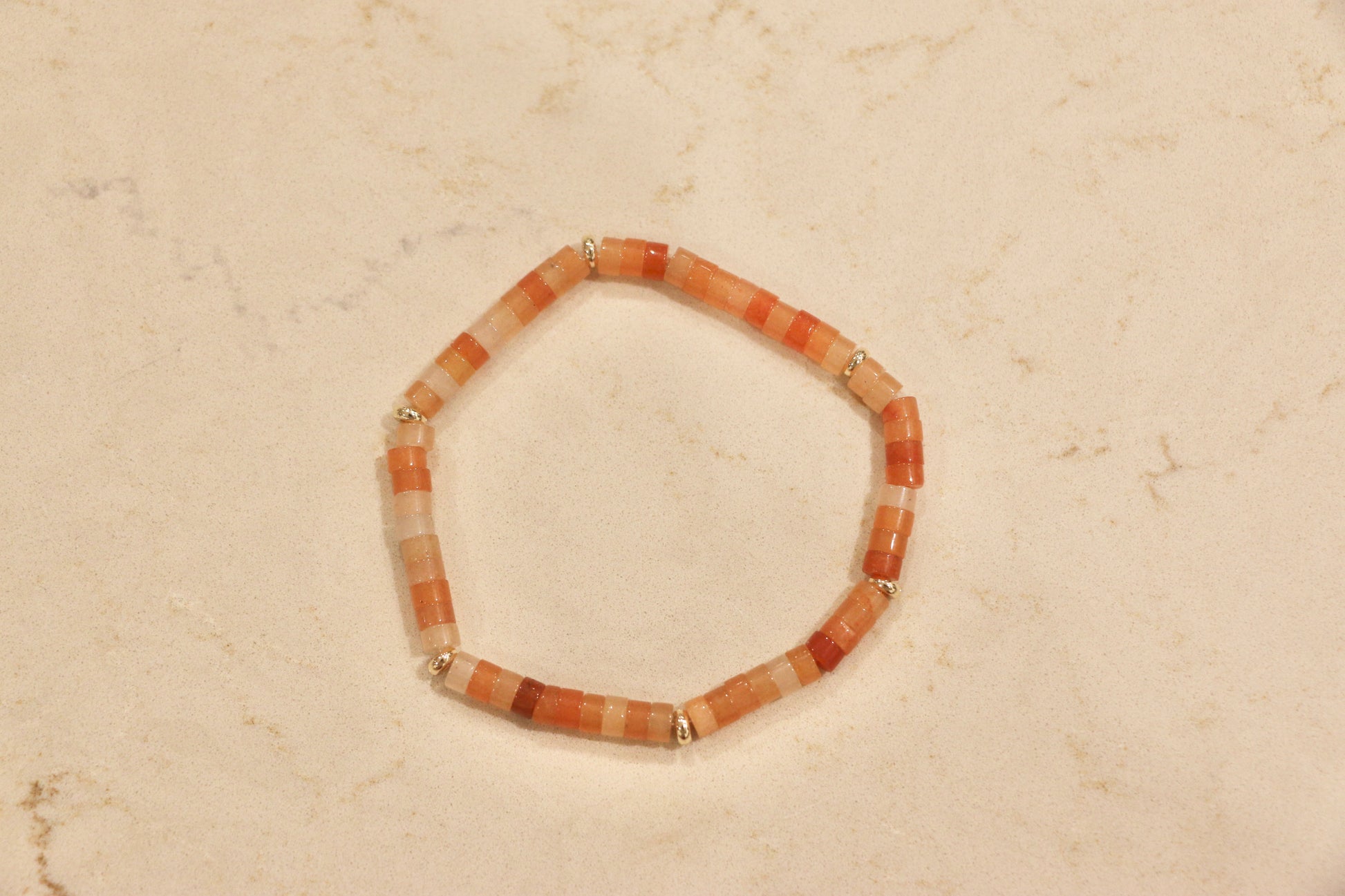 Our Pumpkin bracelet features 4mm Red Aventurine heishi beads accented with gold filled spacer beads.